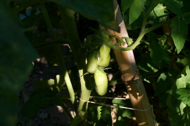 そして今夏の本命、トマト。サンマルツァーノという細長いヤツです。こちらでは菌類だかカビだかを避けるために、Acqua ramata(銅の水)と呼ばれる水色の鉱物ベースの農薬をかけますが、薄気味悪いし、面倒くさいしで無農薬です。無農薬ですが、去年の余ったトウガラシで作ったトウガラシ水をかけてカメムシ・なめくじ対策にしています。効果はあるのか分かりませんが、気休めです。