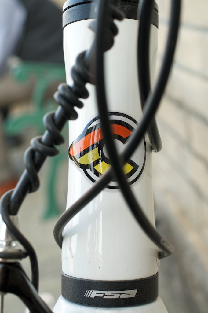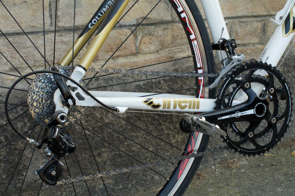 でも、そこがまたいいじゃありませんか。ビアンキほど浮ついたイメージもなく、デ・ローザほど高級路線でもなく。。。知る人ぞ知る、そういうのが好きなのです。親会社が大手フレームパイプメーカーのコロンバスというのも、何となく信頼が置けるというか。ちなみに、フォークとリアステーのみカーボン、あとはアルミです。車重実測9キロ弱。