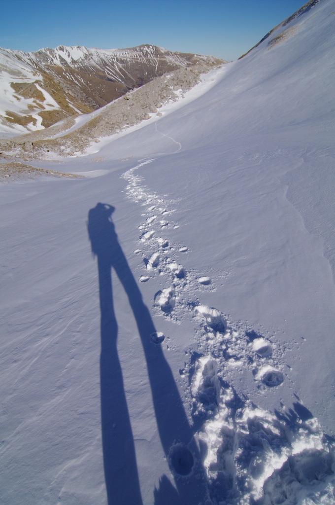 まずはフォーチェ村(945m)からピラート湖(1900m)まで、夏の日帰りだったら3時間かからないところを4時間かけて登った。「どうやら今の体力でこの荷物だと夏の5割増の時間はかかるな。日が落ちるのは4時半、今はもう12時。こりゃ宿泊予定地まではつけんね。思ったより雪あるし」と本来の行程半ばであきらめが入った。今や妻ばかりか子もある身、無理は禁物だ……というよりも、いいわけ(伊語でベッラ・スクーザ〝美しい釈明〟)の種がまたひとつ増えた。ただの体力不足だよな。