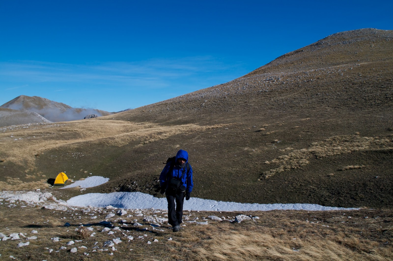 ラピュタ撮影を再挑戦しに、前回と同じ稜線に向かいました。今度は気温五度、風速10メートル強(体感温度約零下五度)の予報が出ていたので、タープはやめてテント泊。 早めに出発してカステッルッチョ村の夕景と日の出を撮るつもりでしたが、チョロチョロ写真を取りながら歩いているうち、やはり日はくれてしまい、稜線の反対側の村は闇の中。しかも朝のカステッルッチョには期待していたより高い雲がかかっていて、前回の風景の再現はならず。